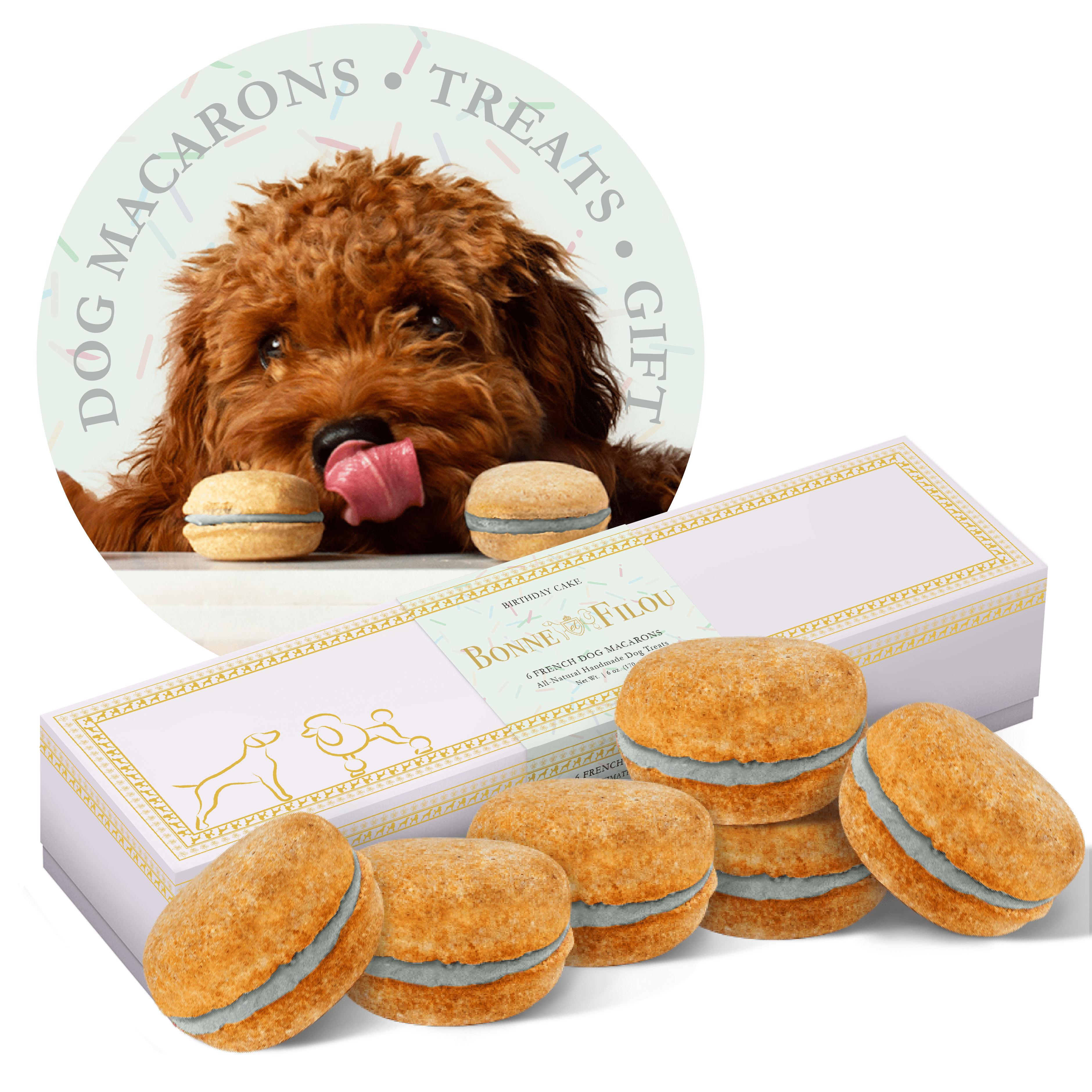 Dog Macarons - Count of 6 (Dog Treats | Dog Gifts)This box of our premium macaron treats features: - Box of 6 dog macarons- Handmade with premium human-grade ingredients in the USA- 100% natural; corn-free; wheat-free ingredients- No artificial coloring or preservatives- Hard treat designed for a long-lasting chew- Shelf life of 12+ months | No need for refrigerationBase Recipe Ingredients: Oat Flour; Honey; Coconut Oil; All-Natural Flavored Yogurt FillingFeeding Instructions:Our treats are hard; designed for a long-lasting chew. For elderly or small dogs; we recommend breaking the treat in smaller pieces (by twisting both sides).