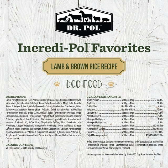 Dr. Pol Incredi-Pol Favorites Lamb and Brown Rice Recipe Dog Food is an irresistibly tasty, nutritionally complete kibble your pup will love! Real lamb is the #1 ingredient, offering a high-quality source of protein to maintain muscle function. Every bite is packed full of vitamins and minerals, with fiber from brown rice to support digestion and vegetables to strengthen your dog’s immune system. Complete with natural ingredients, you can feel confident that you are giving your dog a balanced, healthy food that will keep them running back for more! With more than 50 years of experience, compassion and love for animals, Dr. Pol’s favorite animal is still a healthy animal. That’s why Dr. Pol Incredi-Pol Favorites are incredible foods - they’re veterinarian formulated with real ingredients for incredible pets.