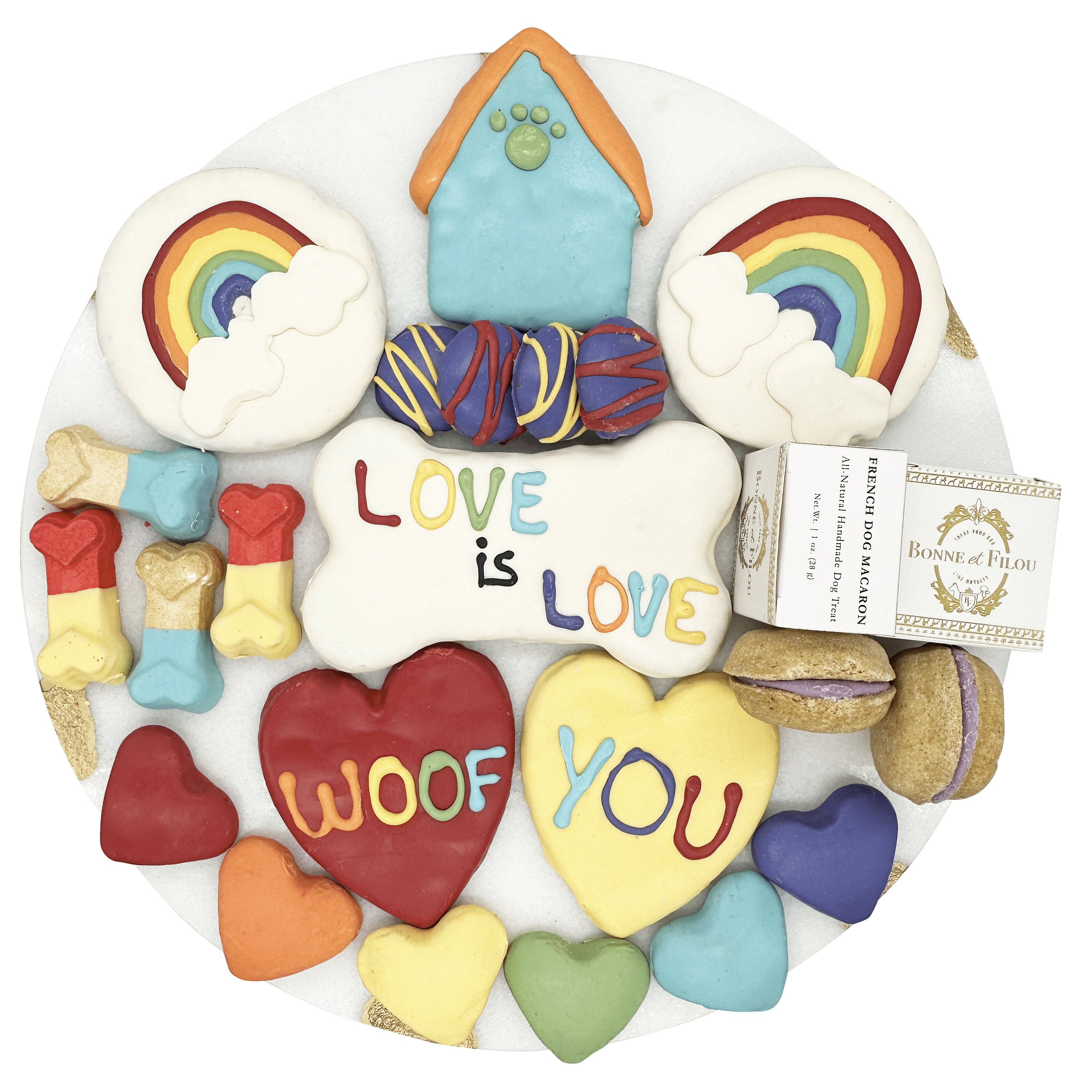 Each ornate gift box comes overflowing with a curated selection of dog-gone delicacies including sumptuous dog macarons, crunchy dog bones, round and heart-shaped treats, all decorated in a rainbow of colors!