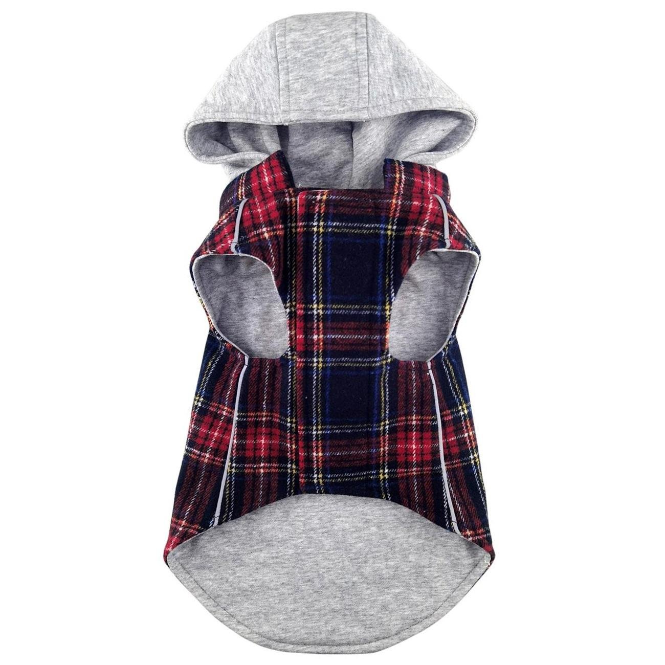 Our Flannel Weekender Sweatshirt Hoodies are great for pups on the go! The outer shell is a soft plaid flannel while the inner lining is cozy, jersey material. The hood is also made of jersey material and can easily zip off when not needed. Reflective stripping makes your pup noticeable in low light while the two-inch fastener down the chest provides an adjustable closure.
