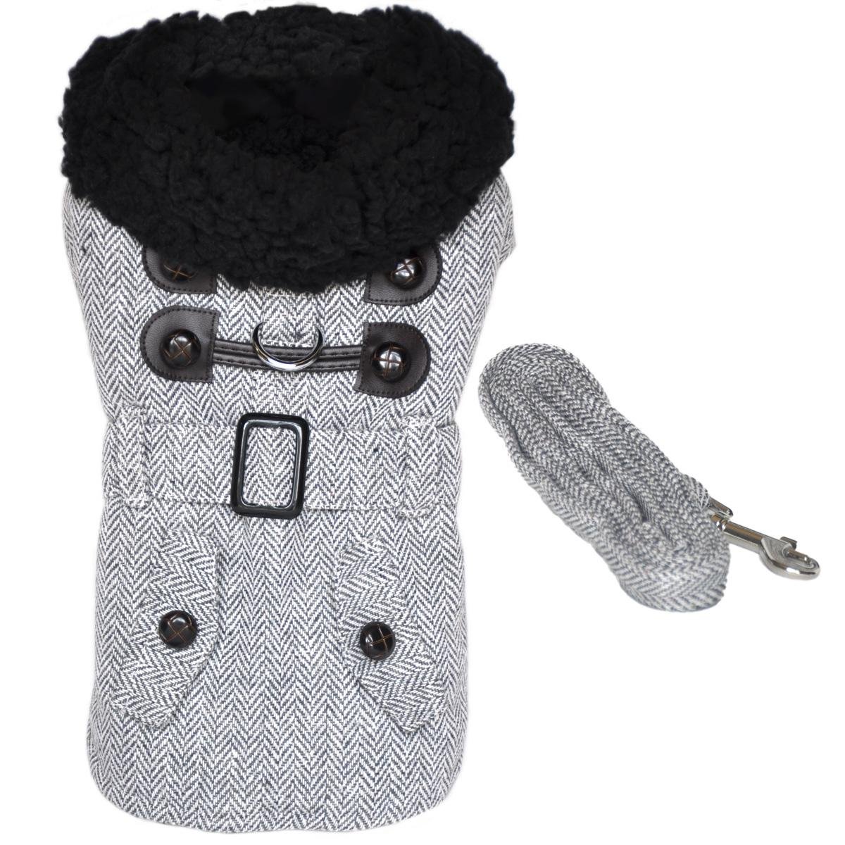 Grey Herringbone Dog Coat Harness with Matching Leash Grey Herringbone Dog Coat Harness with Matching Leash